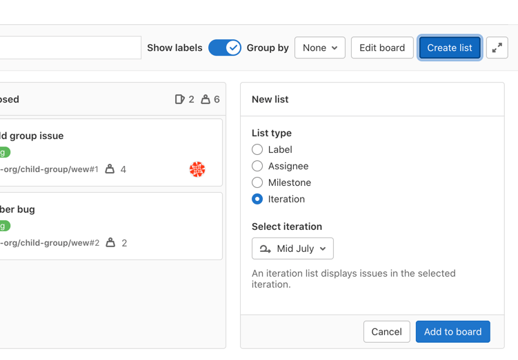 - Filtering by iteration introduced in GitLab 13.6.